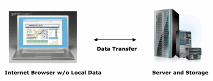 | In mid 1990s, the dawn of the internet again revolutionized the computing model. An internet or 'web-based' system still uses the client-server architecture, however, the client is the ubiquitous internet browser (Figure 2). As every computer comes with an internet browser, you generally don't need to install anything to start using a web system. Furthermore, no data is saved on your local computer, removing potential out-of-sync errors and time delays associated with data synchronization. The requirement, and some might say 'downside', of the web-based model is, obviously, the need of 'always-on' internet connection. |